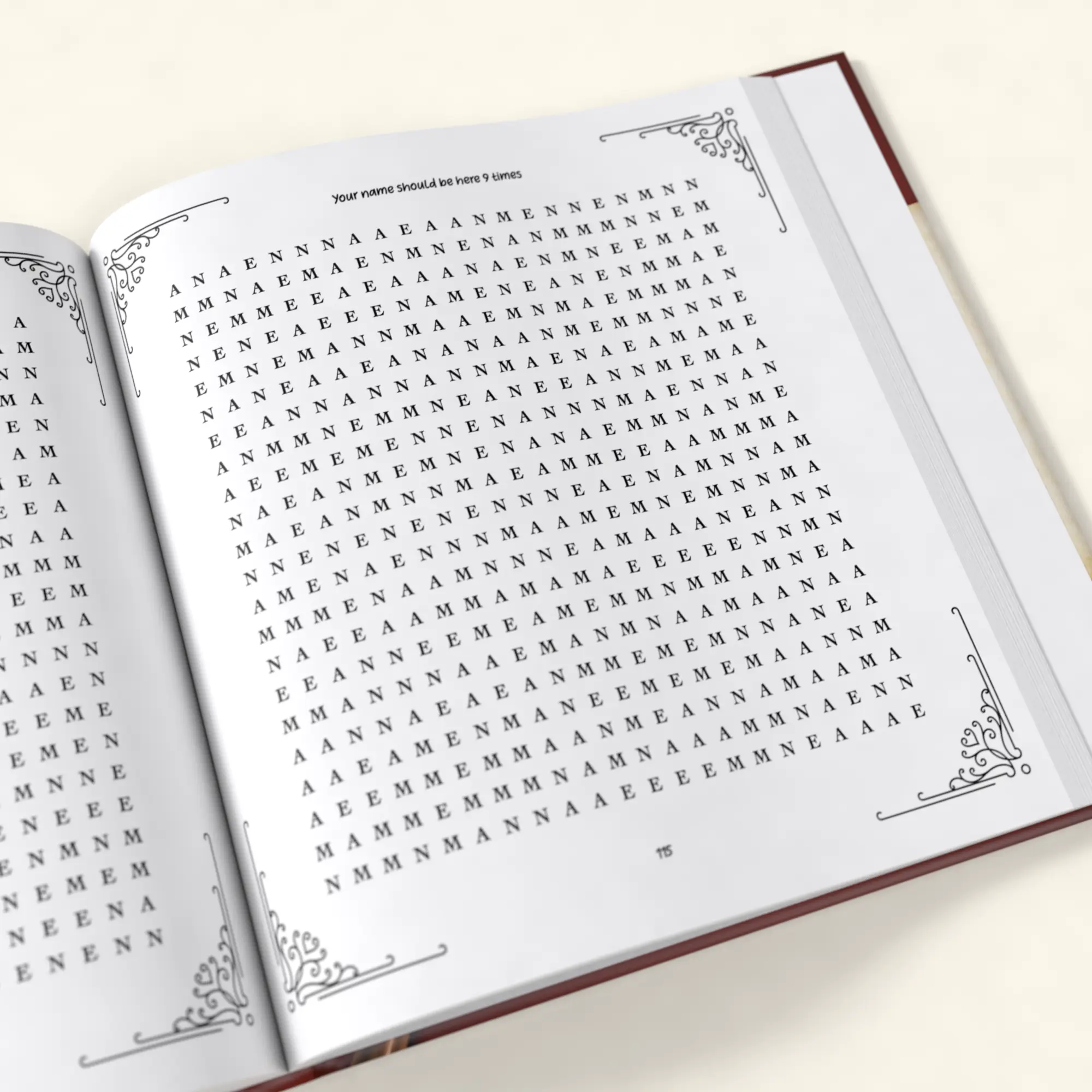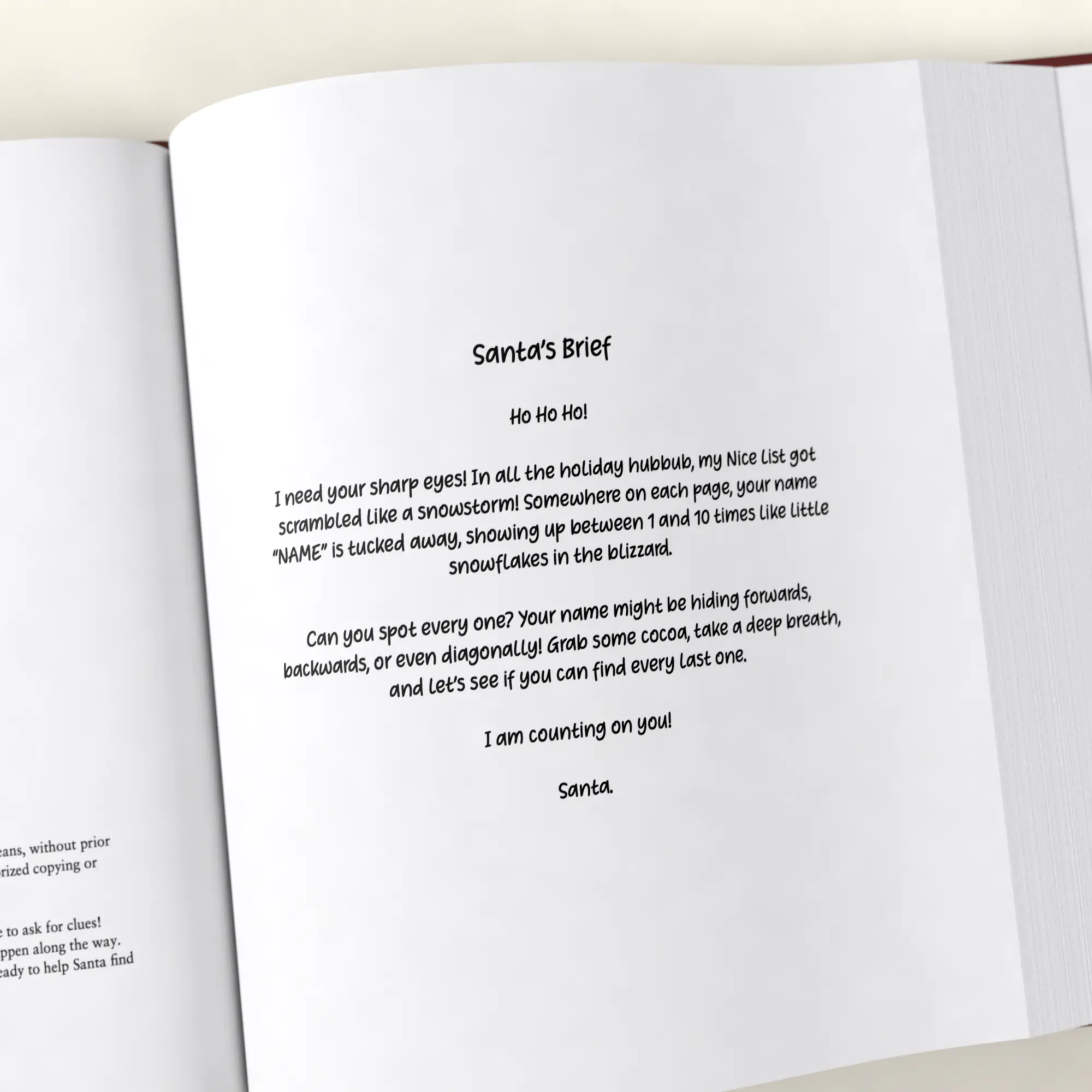 | Description: | This is no ordinary word search. It’s a holiday adventure where Santa’s list has gone awry, and it’s up to you to help him spot your name among the tangle of letters. This is the ultimate test of patience, a name puzzle designed for those who love a holiday challenge. Hidden in the pages is one name, and it could be hiding anywhere. Think it sounds simple? Think again. In this personalized 50/150/500-page book, your name is hidden to keep you guessing. Depending on the option you choose, that elusive name will appear either 1 to 10 times on each page (festive 😊), once per page (a true challenge 🎄), or just once in the whole book (good luck! 🎅). It could be arranged in any direction—up, down, sideways, even backwards—making the search truly merry. No hints, just you, the letters, and a bit of holiday magic. Why you’ll love “Are You on Santa’s List?”: